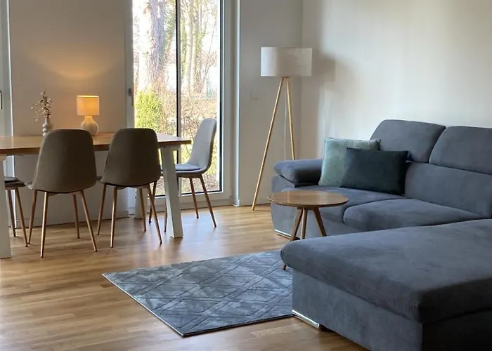 Az 1 szobás Modernes Voll Moebliertes Apartment Am See Mit Garten, Nahe Ber Bestensee egy strand övezetben található, valamint magába foglal egy teraszt tóra néző kilátással. A Korbiskrug 3 km-re fekszik, míg a Tonsee pedig 2 km-re van a 92 m²-es apartmantól.